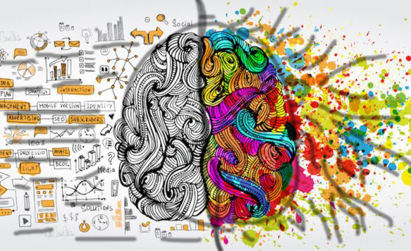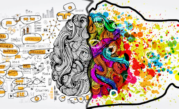 The piece does not have much room to breathe and the proximity could have been emphasized to extenuate the opposites even more had there been some use of negative space. The math and science art are separated and placed in the closer proximity with the black and white side as is the art splatter to the color side. This builds the relationship of the respective background to the paired foreground. The zen-like gray doodle of the brain has clear relationship to its counter part of the colored brain zen brain. Perhaps the purpose of not separating the brain to demonstrate the opposites connection.