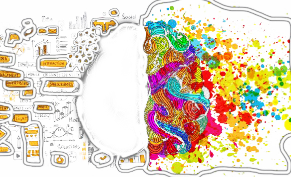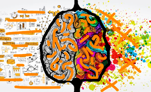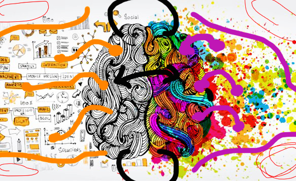 This image shows how the elements correlate in the design. The purple lines show how the creative side of the brain by proximity is linked to the splatter. The black lines show the connection between the two sides. The orange lines show the connection to the gray and black side of the brain to the logical diagrams. The read lines show the limited space and where perhaps more space could have been added.